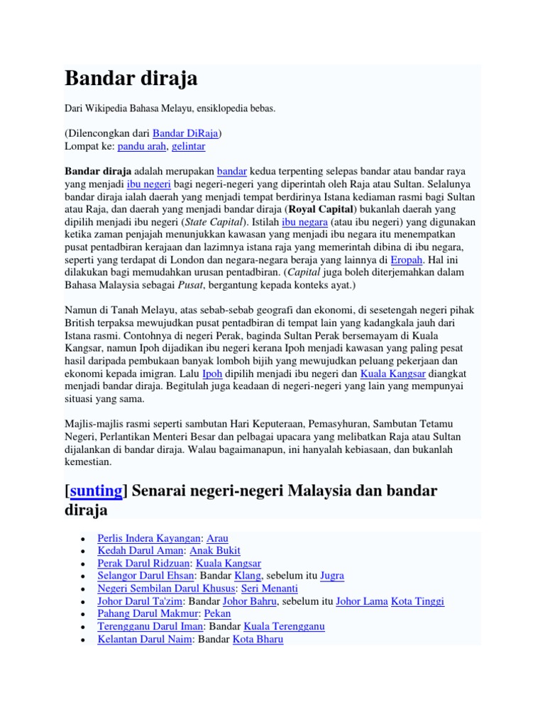 Senarai Negeri Negeri Di Malaysia Yang Memiliki Pemerintahan Beraja Beserta Lokasi Istana Rasmi from imgv2-1-f.scribdassets.com It was recently declared as the royal town of johor by sultan ibrahim sultan iskandar and is the fourth largest city (after johor bahru, batu pahat and kluang) in johor. It is one of the most popular tourist attractions in malaysia to be visited and explored for its food, coffee and historical prewar buildings. Kuiz ibu negeri dan bandar diraja di malaysia draft. Klang bakal menjadi sebuah bandar raya warisan diraja pertama malaysia menjelang 2035, menerusi projek rancangan tempatan (rt) mpk 2035 (penggantian). Kamus bergerak 9 bandar diraja terbesar di malaysia. 9 bandar diraja terbesar di malaysia 1. Klang menjadi ibu kota kerajaan sebelum ditukar kepada kuala lumpur. Senarai lapangan terbang di malaysia wikipedia bahasa melayu ensiklopedia bebas.