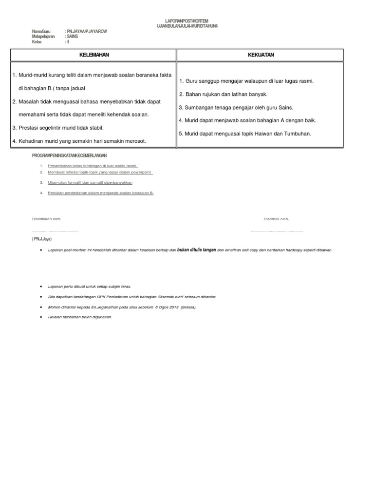 Smk taman daya, pasir gudang laporan post mortem peperiksaan _ tahun program leap frog ( penggunaan modul yang terdiri dari soalan kbat) iii. This is different from a retrospective, in which both positive and negative things are reviewed for a project. Kekuatan spm 2017 pelbagai program telah dilaksanakan mengikut aras pelajar silibus selesai seawal jun bagi membolehkan latih tubi dilaksanakan dengan masa yang lebih panjang latih tubi menggunakan. Learning more about illnesses and medical conditions benefits patients too. Sekolah menengah kebangsaan jengka pusat 26400 bandar jengka , pahang darul makmur laporan post mortem karnival sukan pra u sekolah menengah kebangsaan jengka pusat nama nurul farahzuanie binti husaini no.